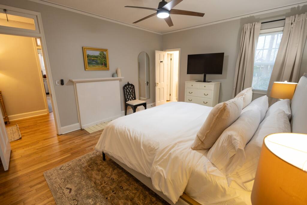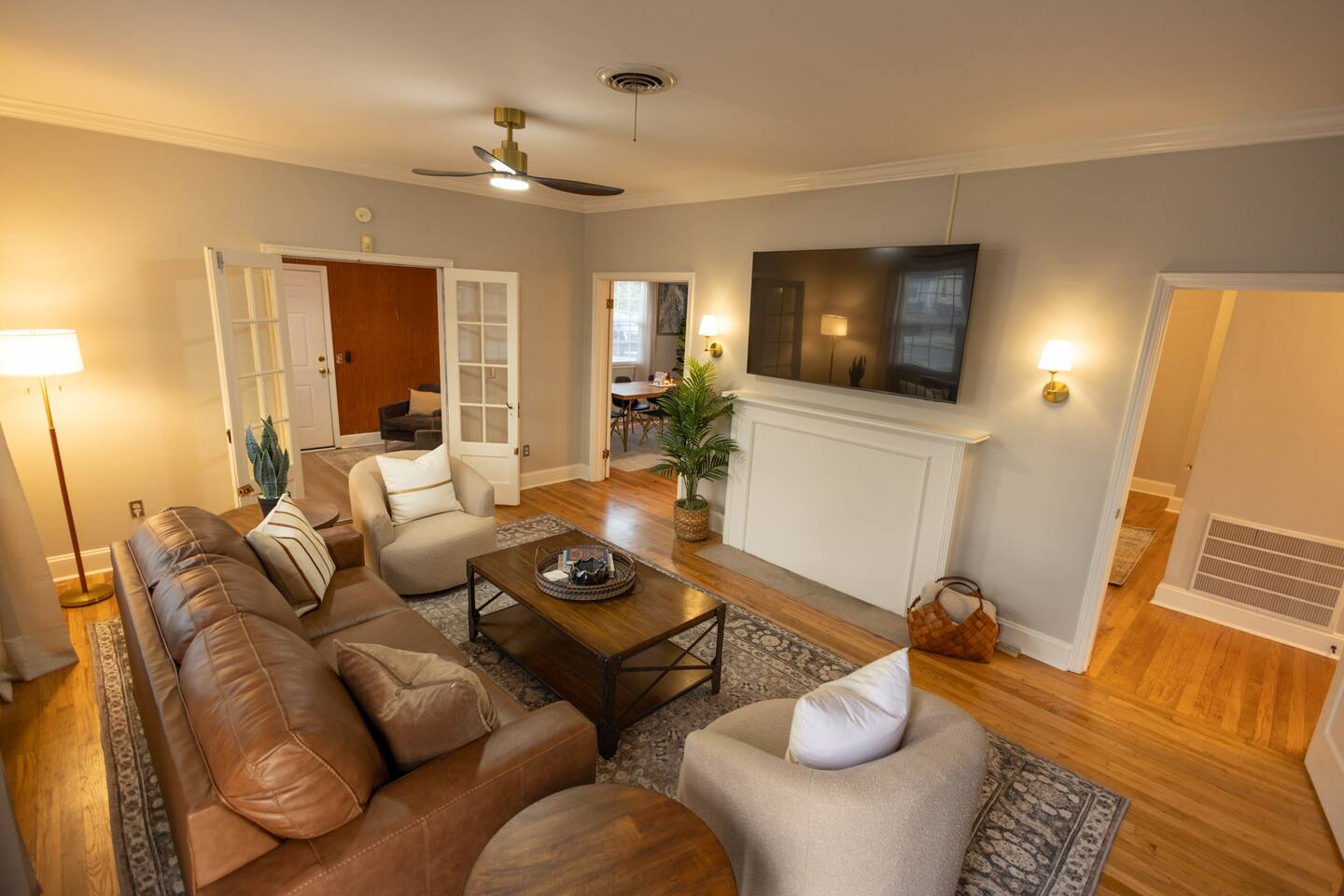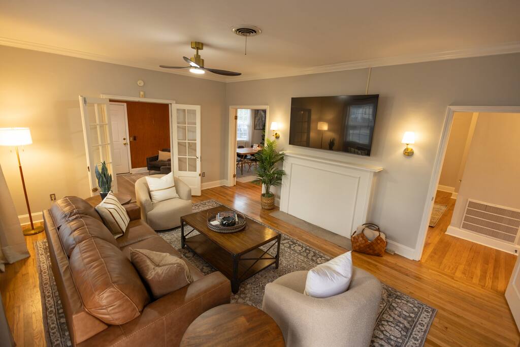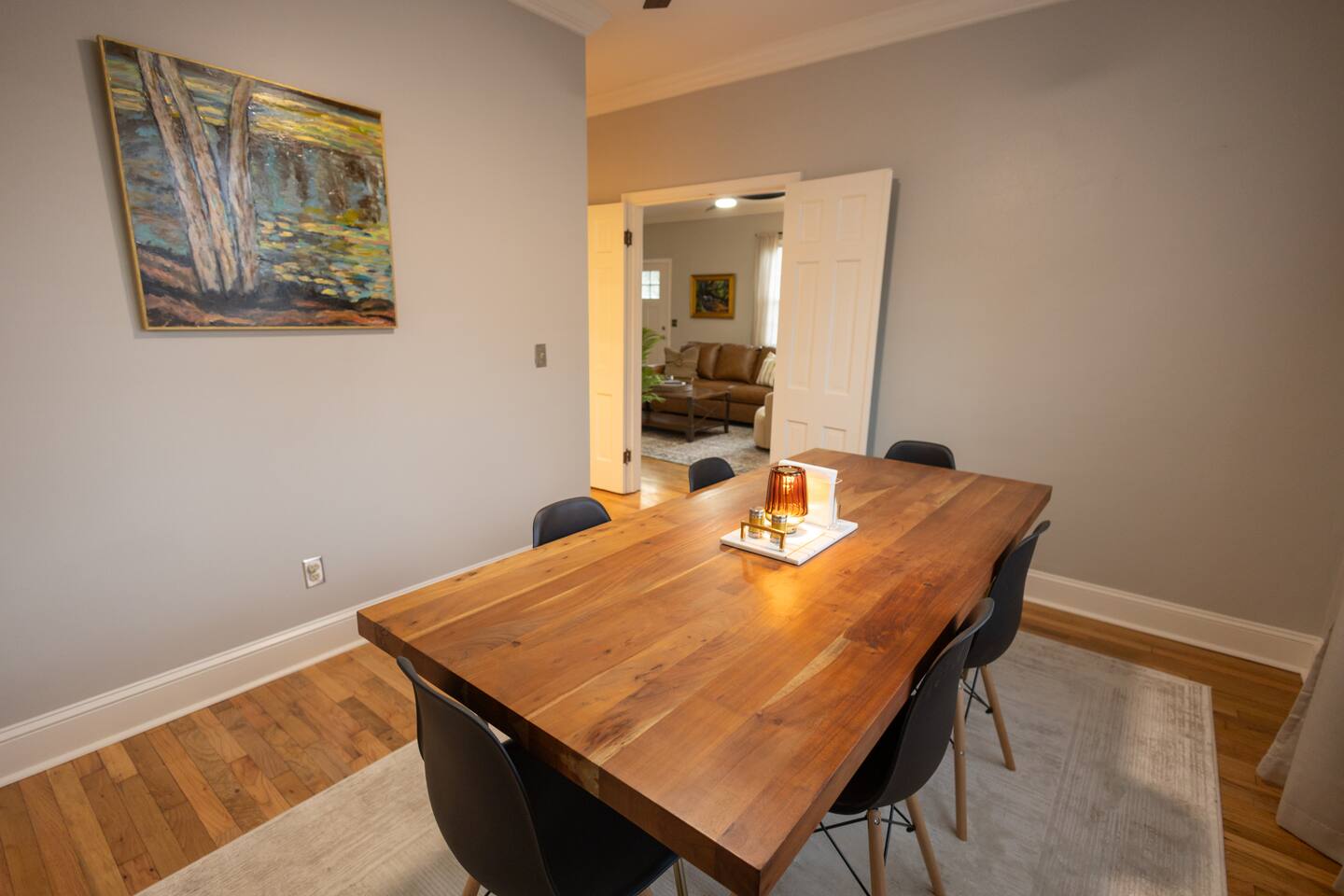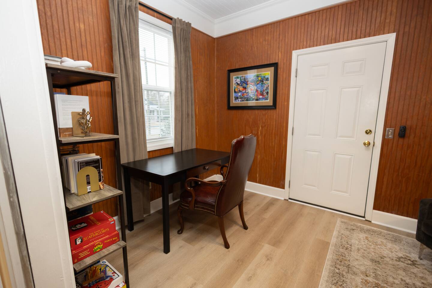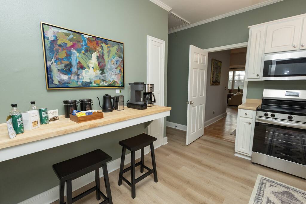 **The Home** This thoughtfully renovated house blends historic character with modern comfort and space to spread out. Features include: 3 bedrooms all with blackout curtains and smart TVs 2.5 bathrooms Dedicated office/workspace with reading nook Comfortable living room furnished by local vendors and a 70- inch smart TV Fully equipped kitchen with coffee bar Dining room for shared meals Washer & dryer Paintings by local artists Lachele Yancey, Ruthie McKenzie, and Debbie Parker Sound Machine Nintendo Switch and Games DVD Player and Selection of DVDs Card Games, Board Games, and Books Pack and Play Charcoal Grill Fire Pit Free Parking Whether you’re working remotely, traveling with family, or just need room to breathe, the layout is both functional and inviting.