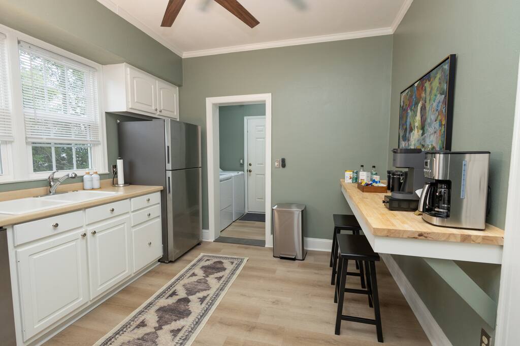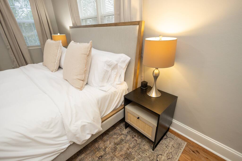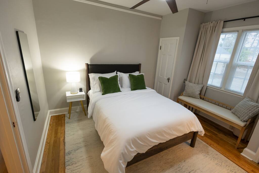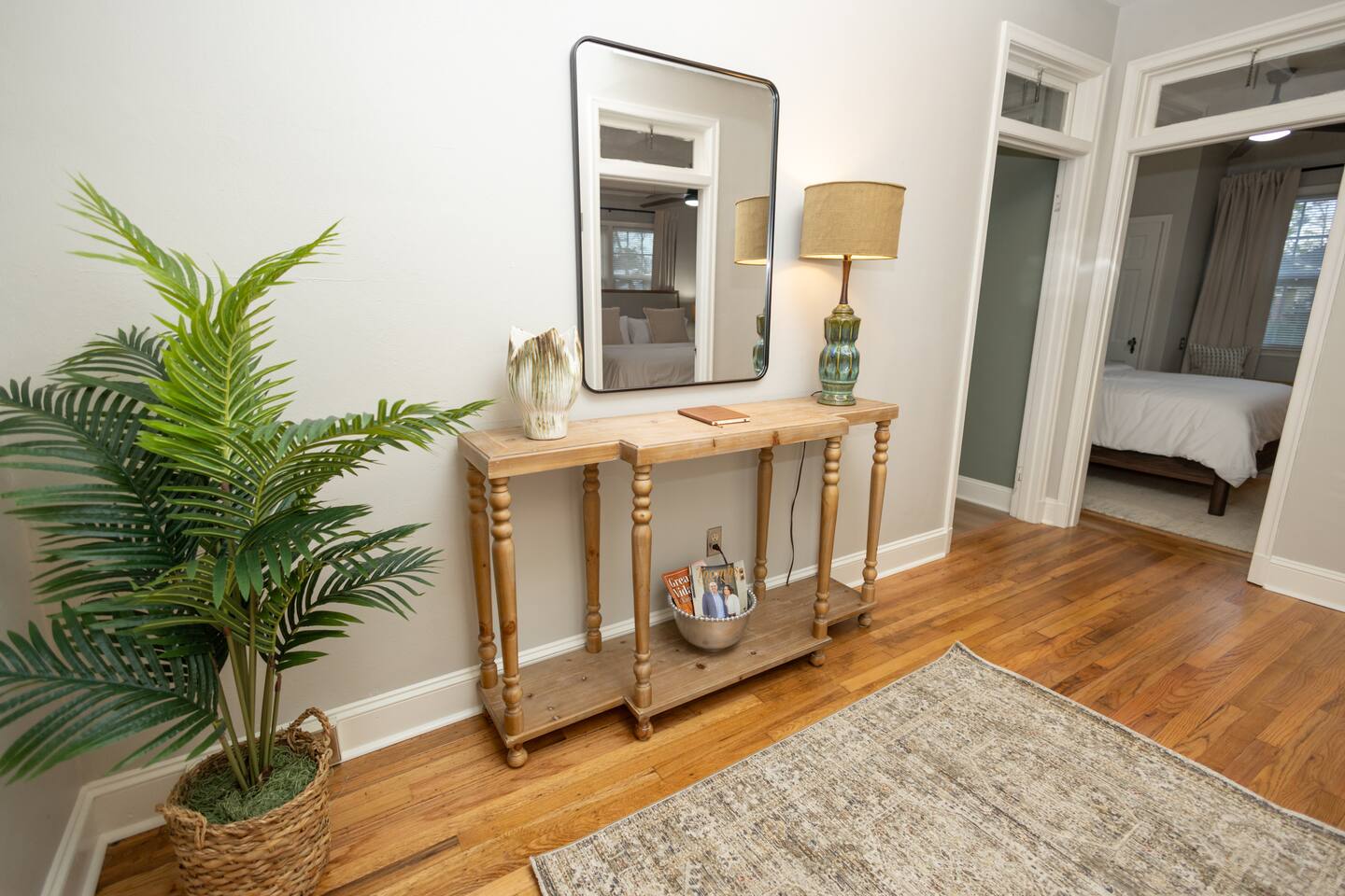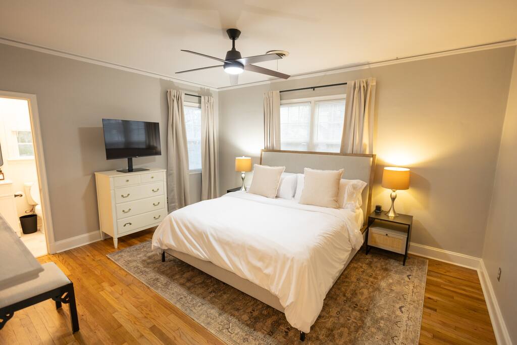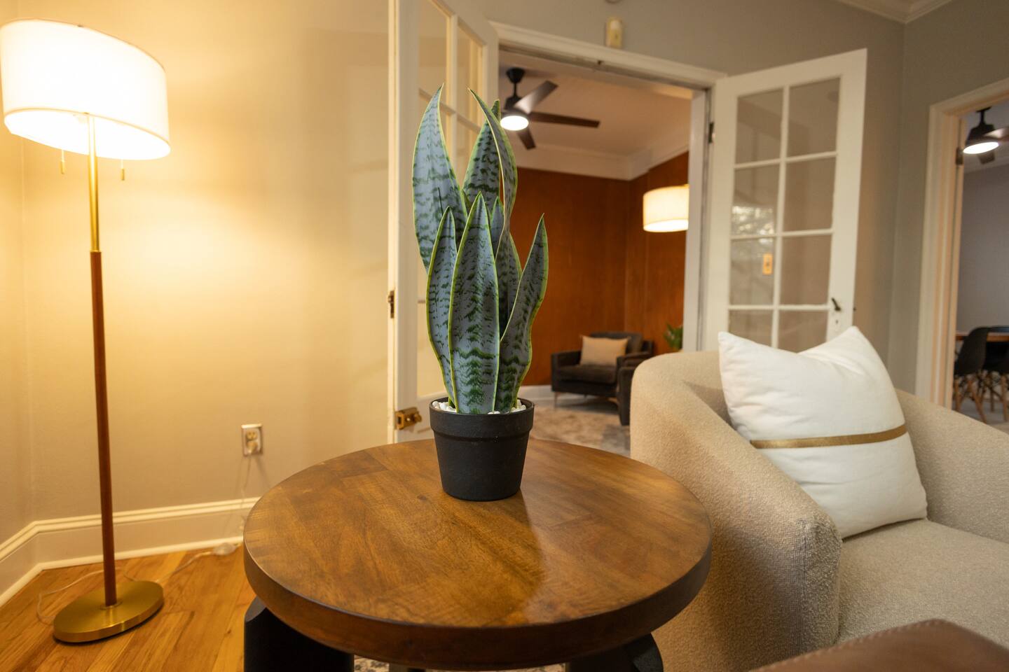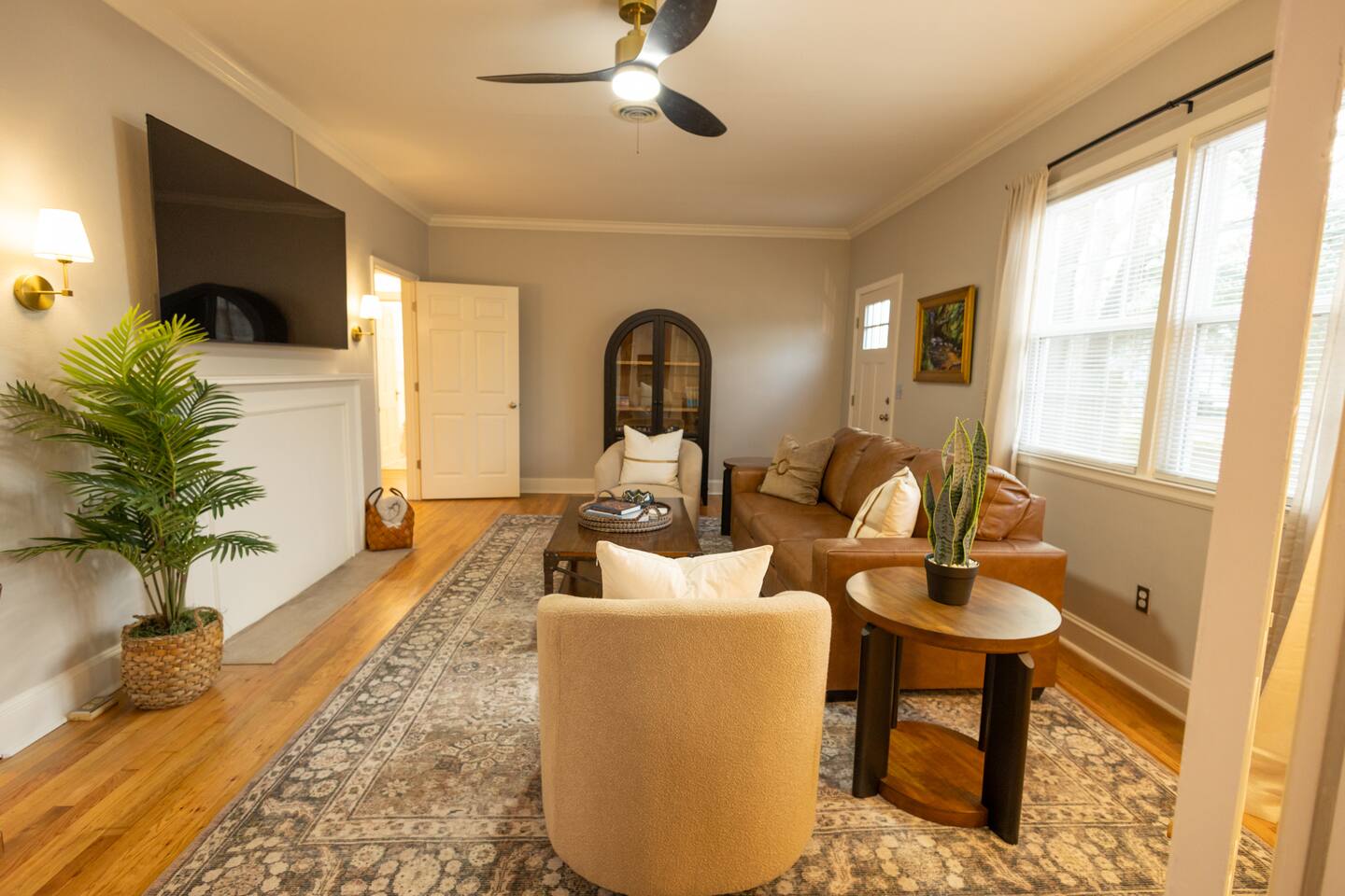 **The Home** This thoughtfully renovated house blends historic character with modern comfort and space to spread out. Features include: 3 bedrooms all with blackout curtains and smart TVs 2.5 bathrooms Dedicated office/workspace with reading nook Comfortable living room furnished by local vendors and a 70- inch smart TV Fully equipped kitchen with coffee bar Dining room for shared meals Washer & dryer Paintings by local artists Lachele Yancey, Ruthie McKenzie, and Debbie Parker Sound Machine Nintendo Switch and Games DVD Player and Selection of DVDs Card Games, Board Games, and Books Pack and Play Charcoal Grill Fire Pit Free Parking Whether you’re working remotely, traveling with family, or just need room to breathe, the layout is both functional and inviting.